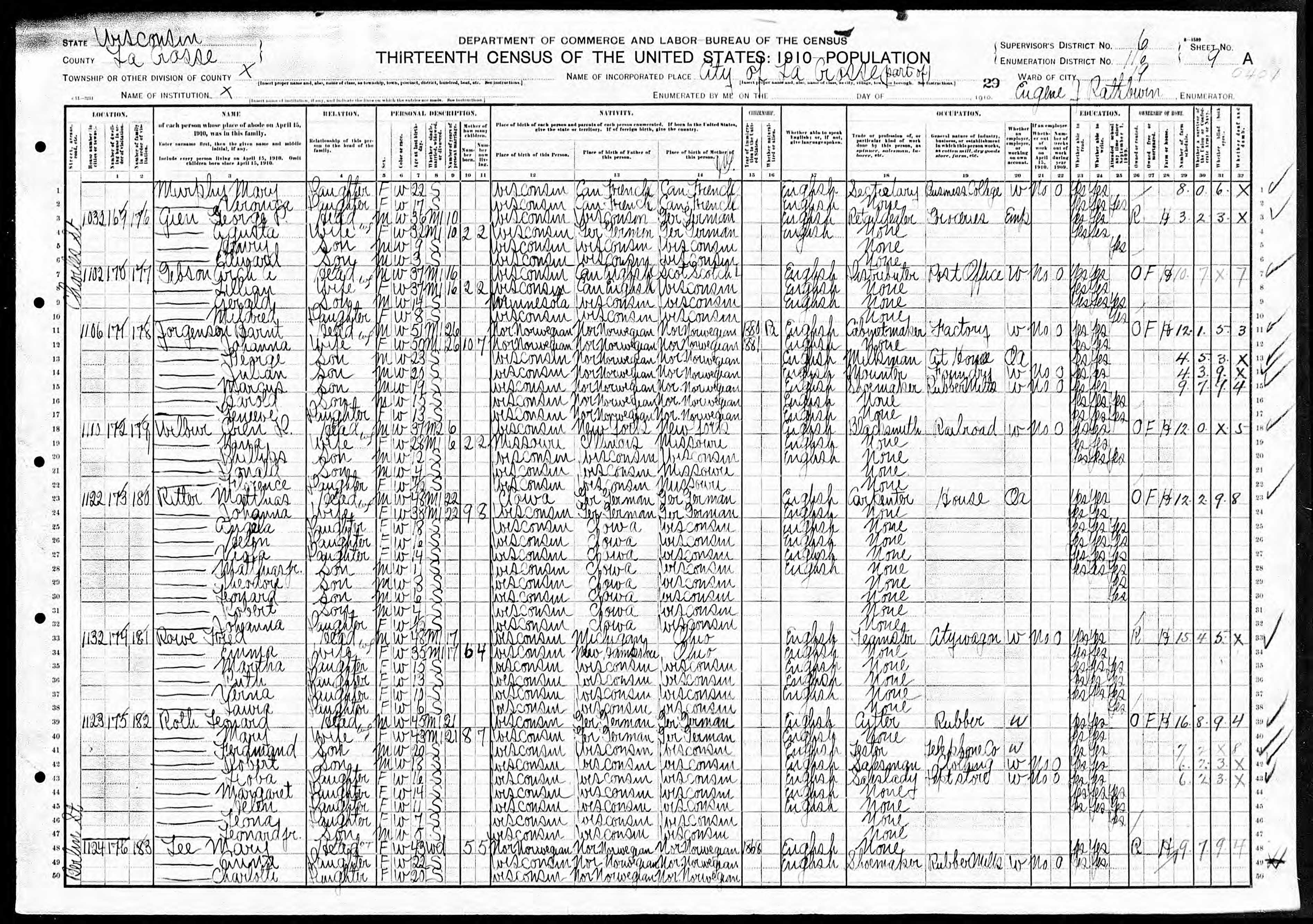 The 1910 census finds the Geins living at 1032 Charles Street in La Crosse. At this time, George owned a grocery store which he later sold to move to the farm in Plainfield. Of 50 residents on the census page, 46 were born in Wisconsin with 1 sneaking in from Iowa and 3 from Norway. They were all working people, in occupations such as blacksmiths, carpenters, teamsters, and shoemakers.