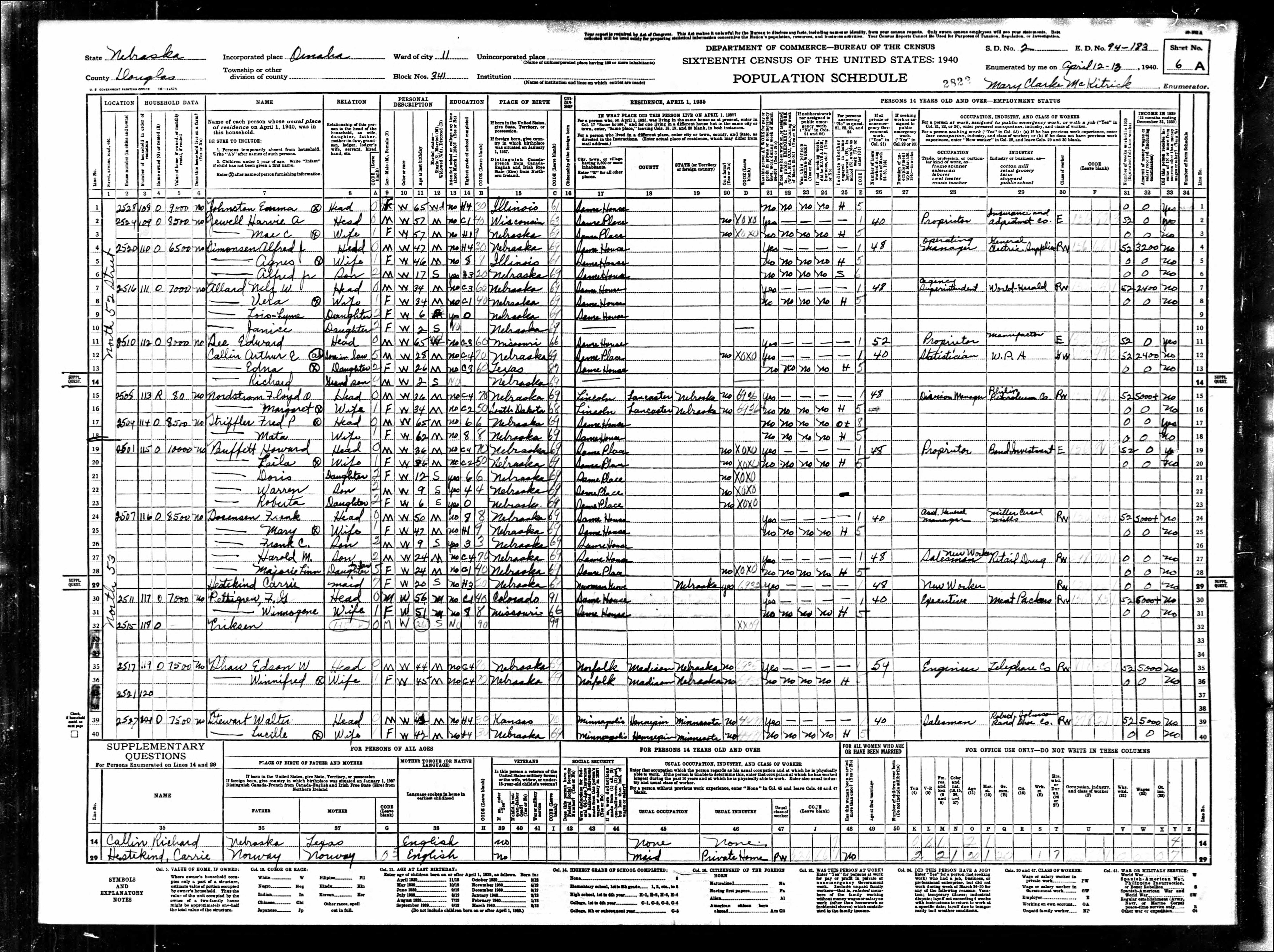 In the 1940 census for Omaha, the Buffetts are living at 2501 N. 53rd Street. Howard is the proprietor of a bond investment company. Sisters Doris (a future philanthropist), and Roberta, along with Warren, were in school.