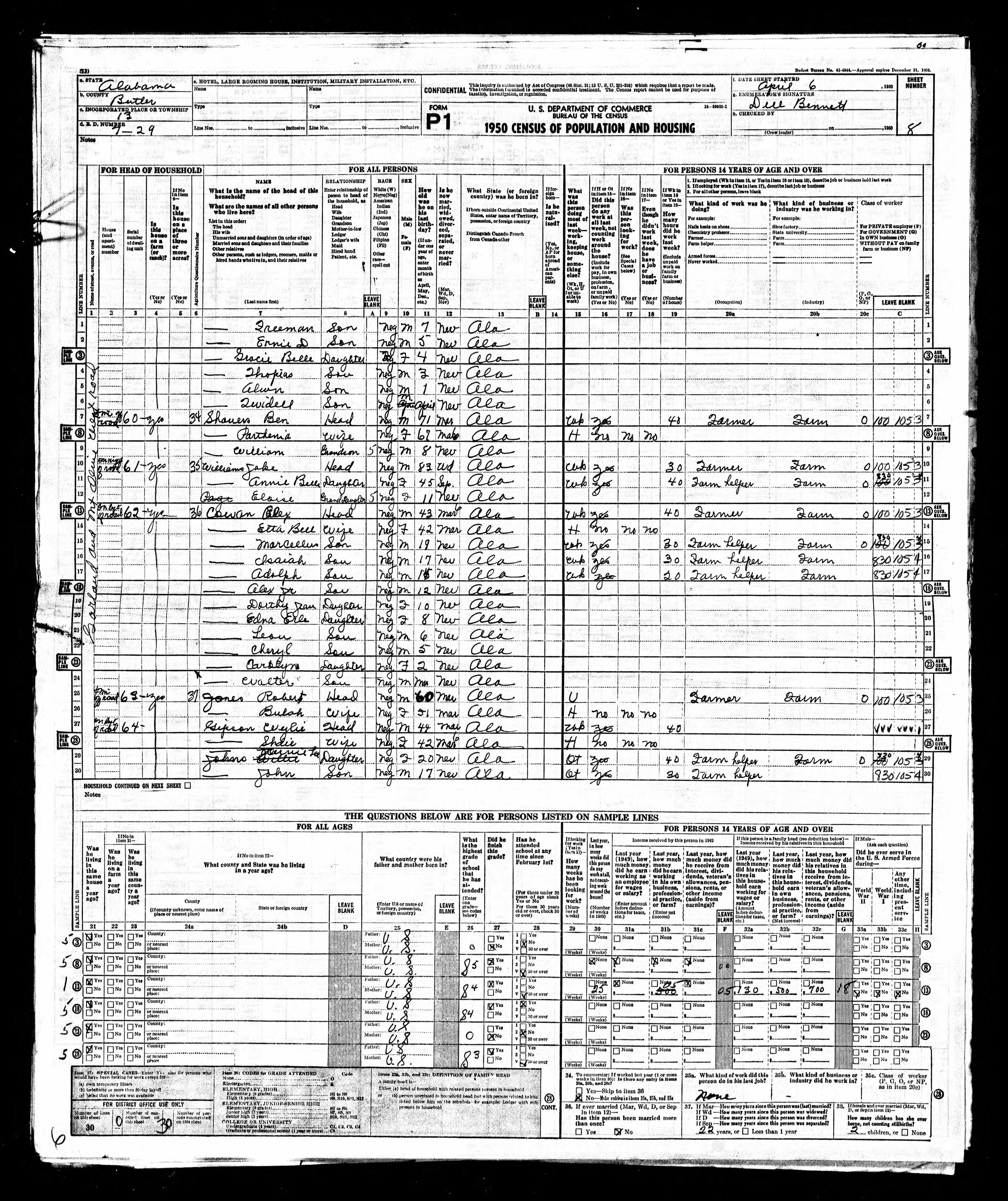 The 1950 Census for Garland, Alabama, has Curtis and Willie living on Mount Olive West Road with 9 children ranging from newborn to 12 years old. Curtis is a farmer, as is everyone else on the two pages of the census. Curtis and Willie were both born in Alabama, the same as everyone else on the two pages.