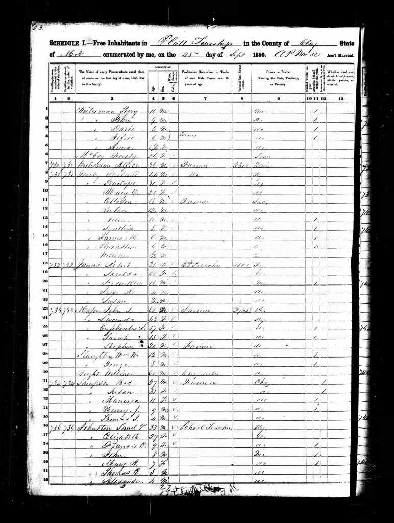 The 1850 census shows the James family living in a farming community in Platte, Missouri. It is a community of large families, as there are only seven families listed with 46 people in those families. Robert James is listed as a Baptist preacher. He was also a farmer and slave owner. This census is dated September 1850, but records regarding Robert James state that he went to California to preach the gospel to gold miners and died there of cholera on August 18, 1850. It’s possible the family wasn’t yet aware of his death when speaking to the census taker. Zeralda James later had her right arm blown off by the Pinkerton Agency when they raided her house looking for Jesse. She made her living after Jesse’s death giving tours of the raided house and selling Jesse memorabilia. Frank James rode with Jesse during his criminal career and died in 1915, having taken over the James house tour business after his mother died.