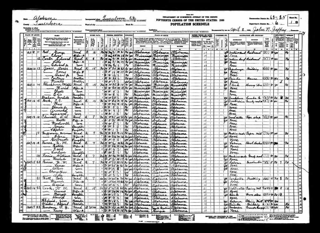 In the 1930 census, the Burns family, including Lurleen’s older brother Cecil, lived at 1207 18th Street in Tuscaloosa. Henry was a laborer at the government docks. Other people on the page worked in jobs such as paper hangers, railroad section hands, sand cutters, and carpenters. Everyone on the page was from Alabama or Mississippi.