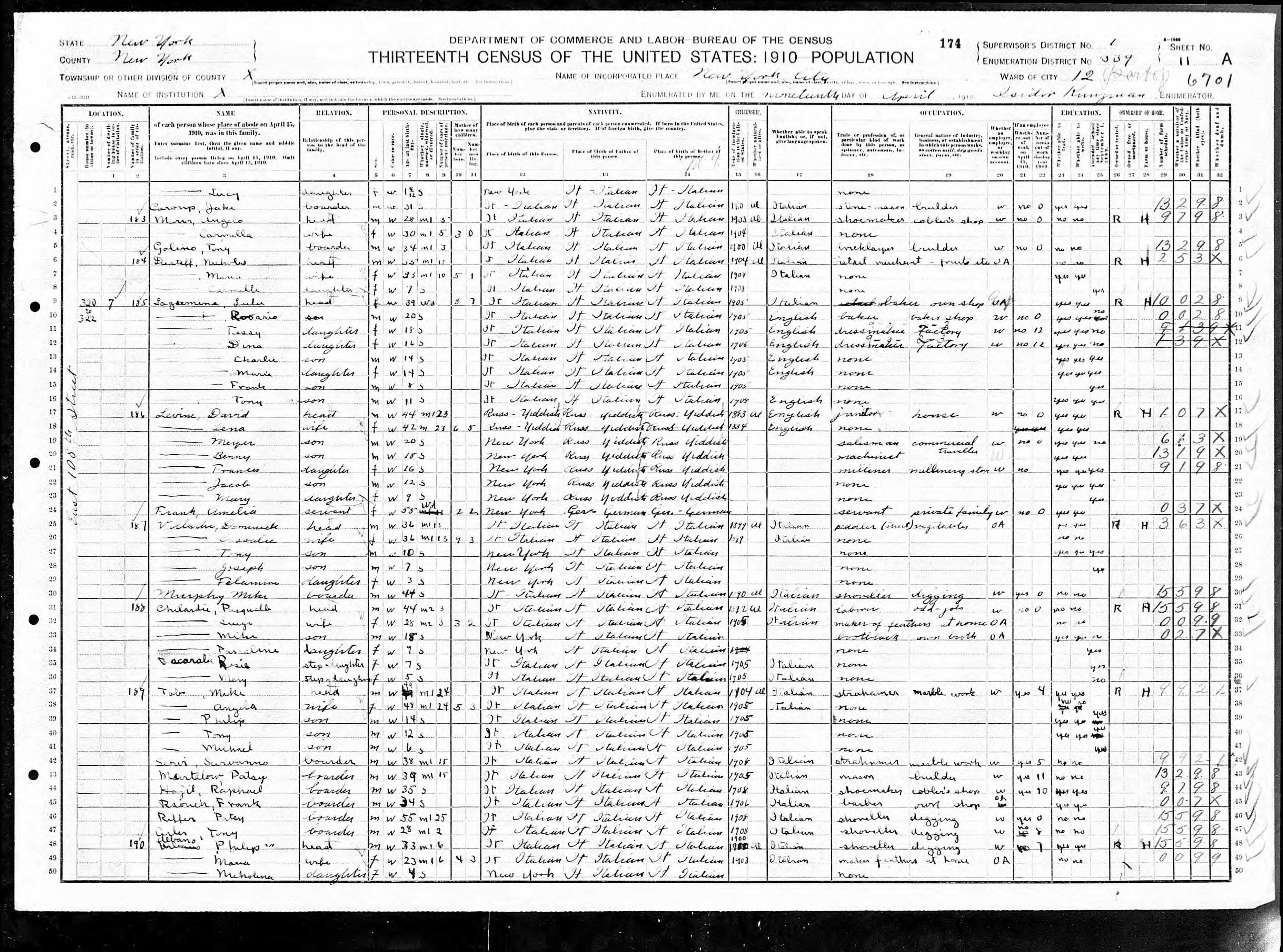 Dominick Villache, his wife (listed as Cassalie), and their 3 children lived on East 108th Street according to the 1910 Manhattan census. They had a boarder, Mike Murphy, who was employed as a shoveller. Dominick was a street peddler of vegetables. Other occupations represented on the street included baker. dressmaker, milliner, and maker of feathers (at home). There were two feather makers and four shovellers on the street.