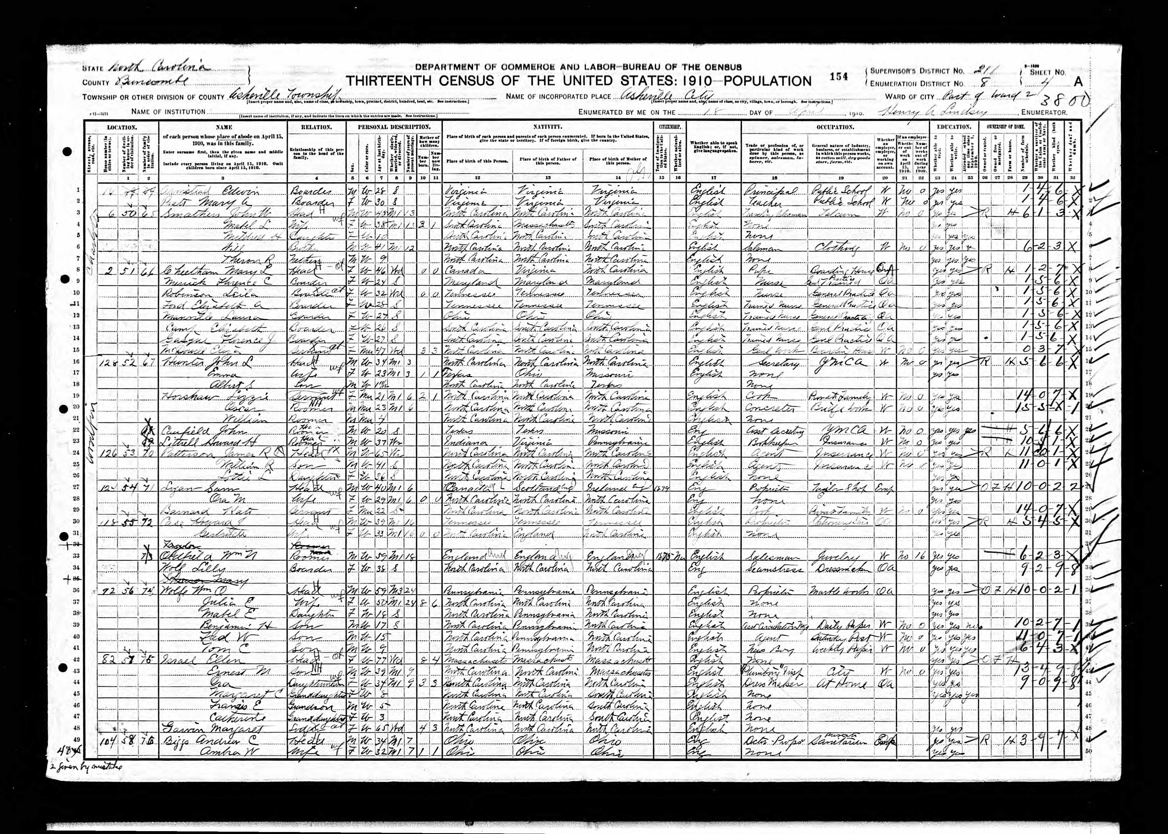 This census sheet shows 15 lodgers out of 49 entries. Six nurses are living in one boarding house, There is a school principal and a teacher and assorted occupations such as two insurance agents, a cook, a plumber, a traveling salesman, and a doctor at a sanatorium. There are two Canadian immigrants and one from England.
